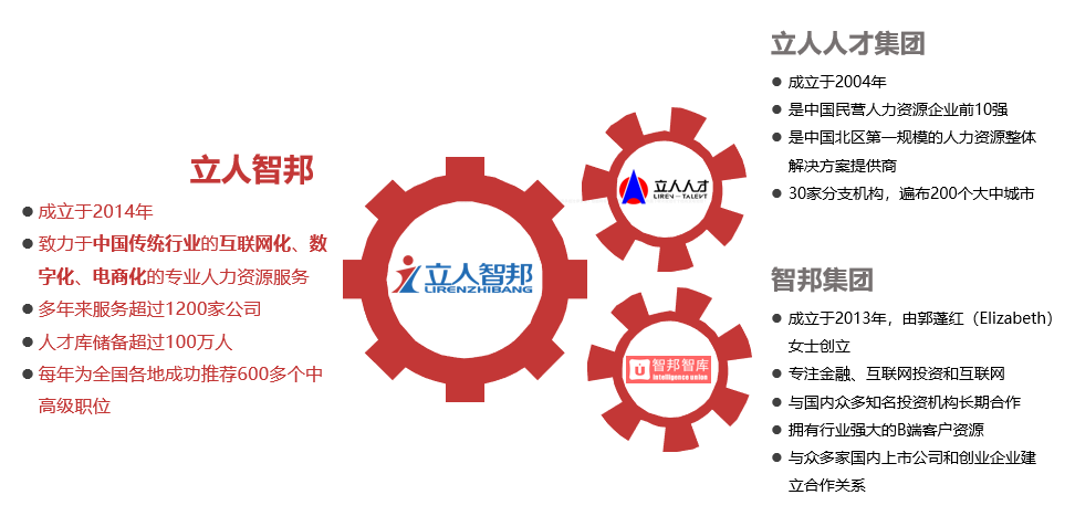 立人智邦成立于2014年,是由立人人才集團(tuán)與智邦人力集團(tuán)強(qiáng)強(qiáng)聯(lián)手共同組建,這兩家公司在業(yè)內(nèi)都具有十余年獵頭經(jīng)驗(yàn)的著名獵頭公司。立人人才集團(tuán)成立于2004年,是中國(guó)民營(yíng)人力資源企業(yè)前10強(qiáng),也是中國(guó)北區(qū)第一規(guī)模的人力資源整體解決方案提供商。立人人才集團(tuán)擁有30家分支機(jī)構(gòu),遍布200個(gè)大中城市。立人人才集團(tuán)組織架構(gòu)為事業(yè)部制,外包事業(yè)部、獵頭事業(yè)部(立人智邦)、管理咨詢事業(yè)部、互聯(lián)網(wǎng)+事業(yè)部。智邦集團(tuán)成立于2013年,由郭蓬紅(Elizabeth)女士創(chuàng)立,在創(chuàng)業(yè)初期以專注互聯(lián)網(wǎng)投資和互聯(lián)網(wǎng)被投企業(yè)提供人才服務(wù)為主線,同時(shí) 探索二三級(jí)城市傳統(tǒng)行業(yè)為輔線。智邦集團(tuán)與國(guó)內(nèi)眾多知名投資機(jī)構(gòu)長(zhǎng)期合作,擁有行業(yè)強(qiáng)大的B端客戶資源。目前已與眾多家國(guó)內(nèi)上市公司和創(chuàng)業(yè) 企業(yè)建立合作關(guān)系,并成就了優(yōu)秀人才的職業(yè)發(fā)展。